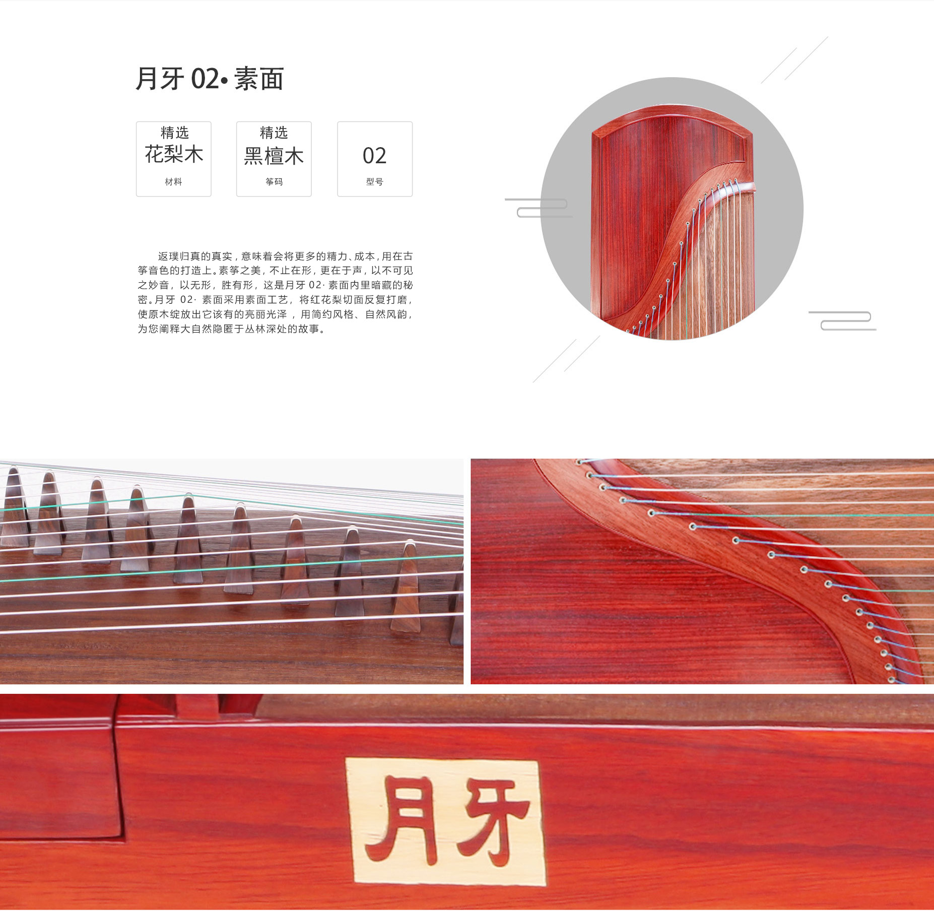 含蓄内敛的民族风范与典雅古朴的古筝融合,月牙02·素面就这样来到了大家面前。月牙02·素面气质沉敛素雅,首先得益于它手工制作,用传统“木艺”打造古筝;再就是它的选材,昂贵的红花梨无论是颜色还是纹理,都有着非同寻常的韵味;再加上没有任何工艺的雕琢装饰,匠心打磨,保留着木材原始、自然的形态,用简单的细腻光泽和平顺纹路打动所有人。
