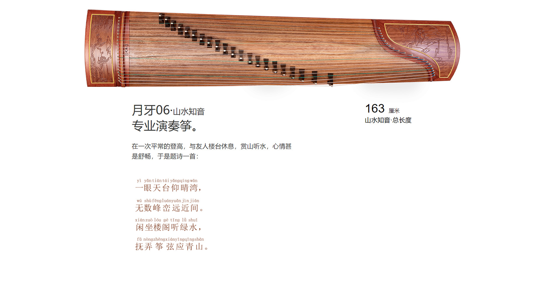月牙·山水知音,正如静静等待被人赏识的山水,用最好的泡桐木面板,长达2年以上的自然风干,纯正红木边料,巧手精细雕刻山水之情,弹奏一曲高山流水,静候一个知音。
