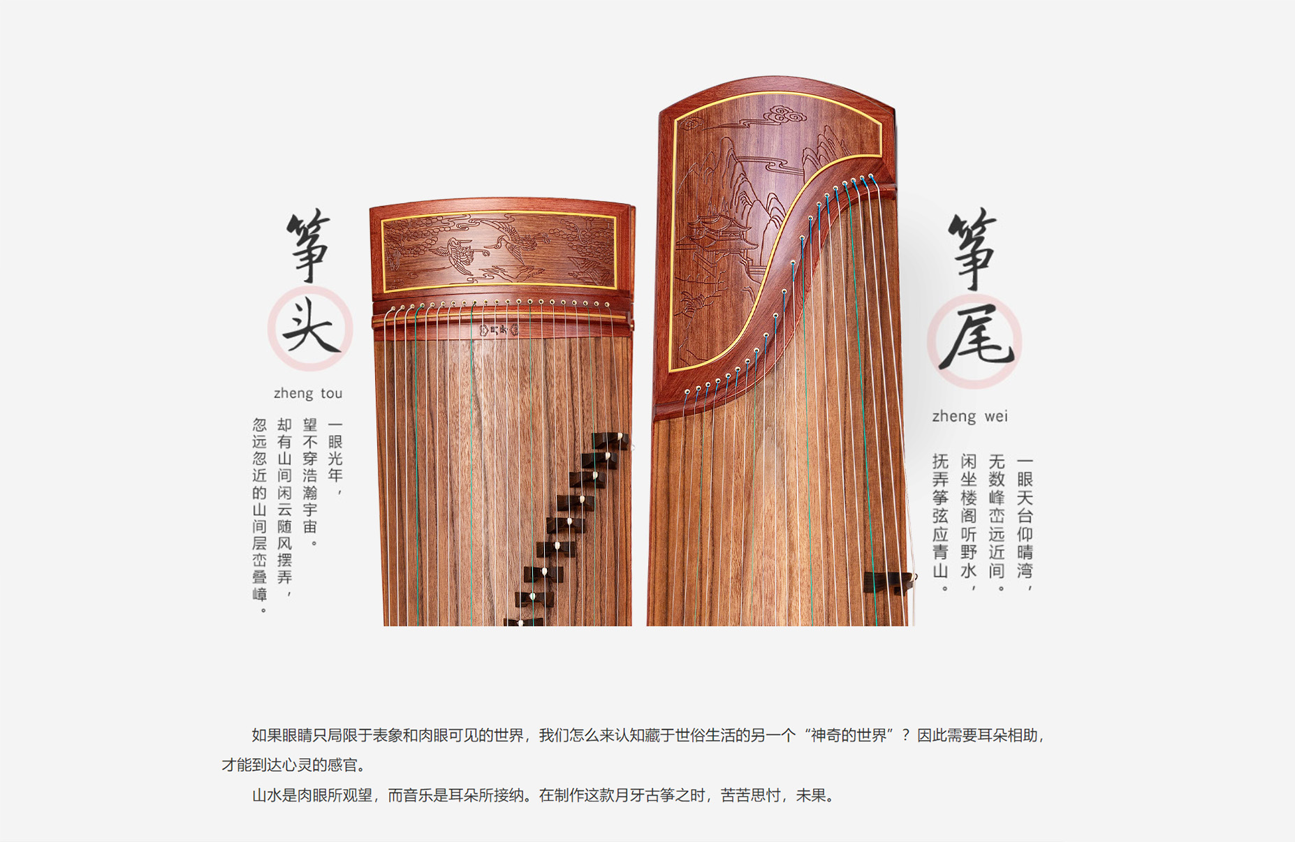 工艺,对于古筝多为外表润色,选择低调的阴刻工艺,隐秘与天外的山水美景,静待赏识之人。好山好水,藏匿得太深,自然也难被发现,但山的巍峨雄峻,水的清澈通明,一直客观存在。