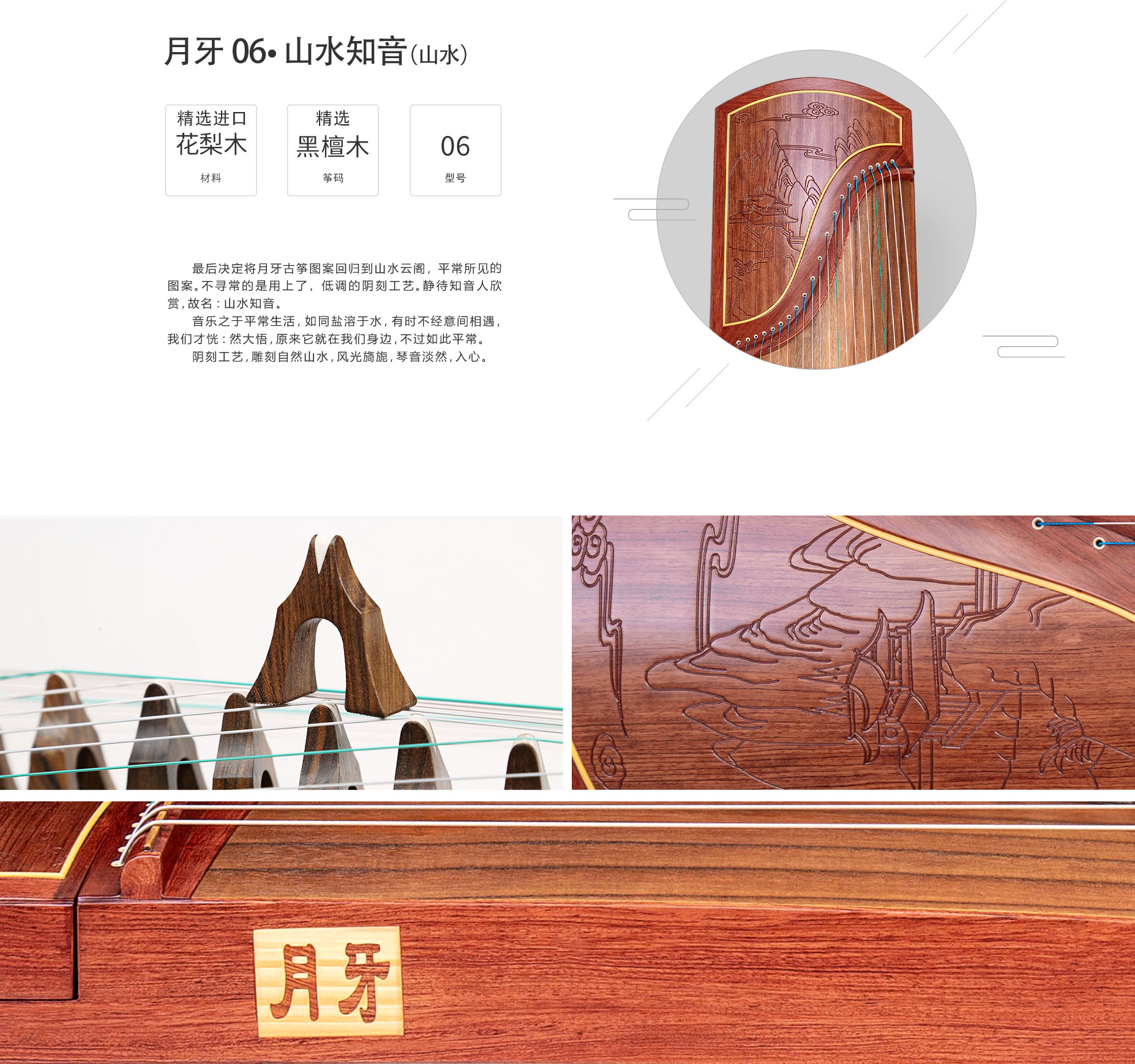 月牙·山水知音,正如静静等待被人赏识的山水,用最好的泡桐木面板,长达2年以上的自然风干,纯正红木边料,巧手精细雕刻山水之情,弹奏一曲高山流水,静候一个知音。